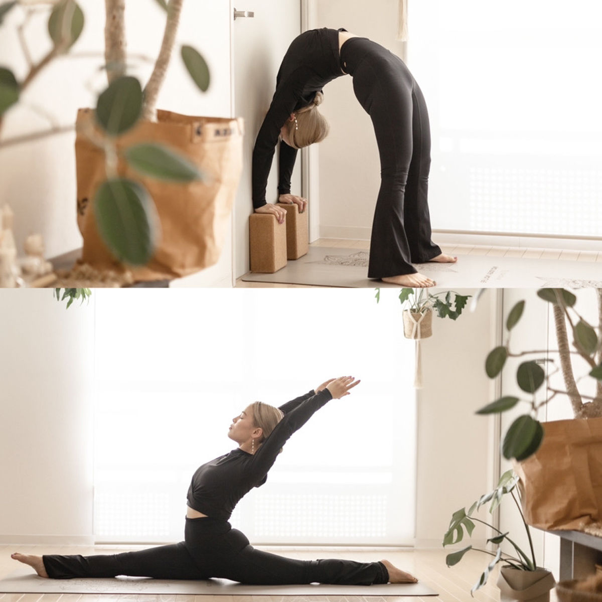 普段の生活で縮まりがちな体の前側を伸ばすことの出来る後屈・身体の中心となる股関節を使う開脚は